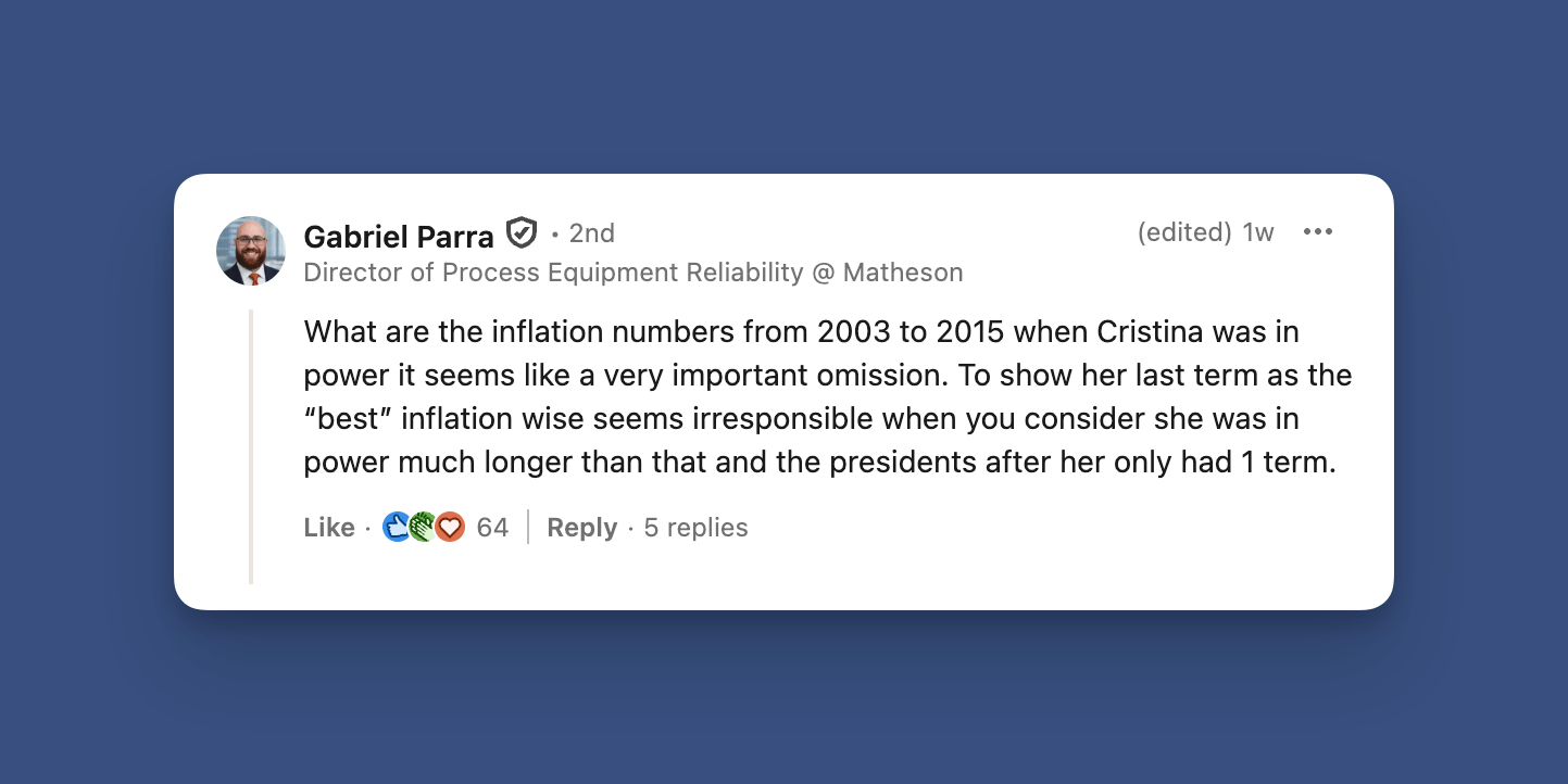 Gabriel adds color to the story of Argentina’s inflation cycles. He’s speaking of Cristina Fernández de Kirchner, who was president for a total of 8 years (succeeding her husband). Should we have included her first term, would the story be different?