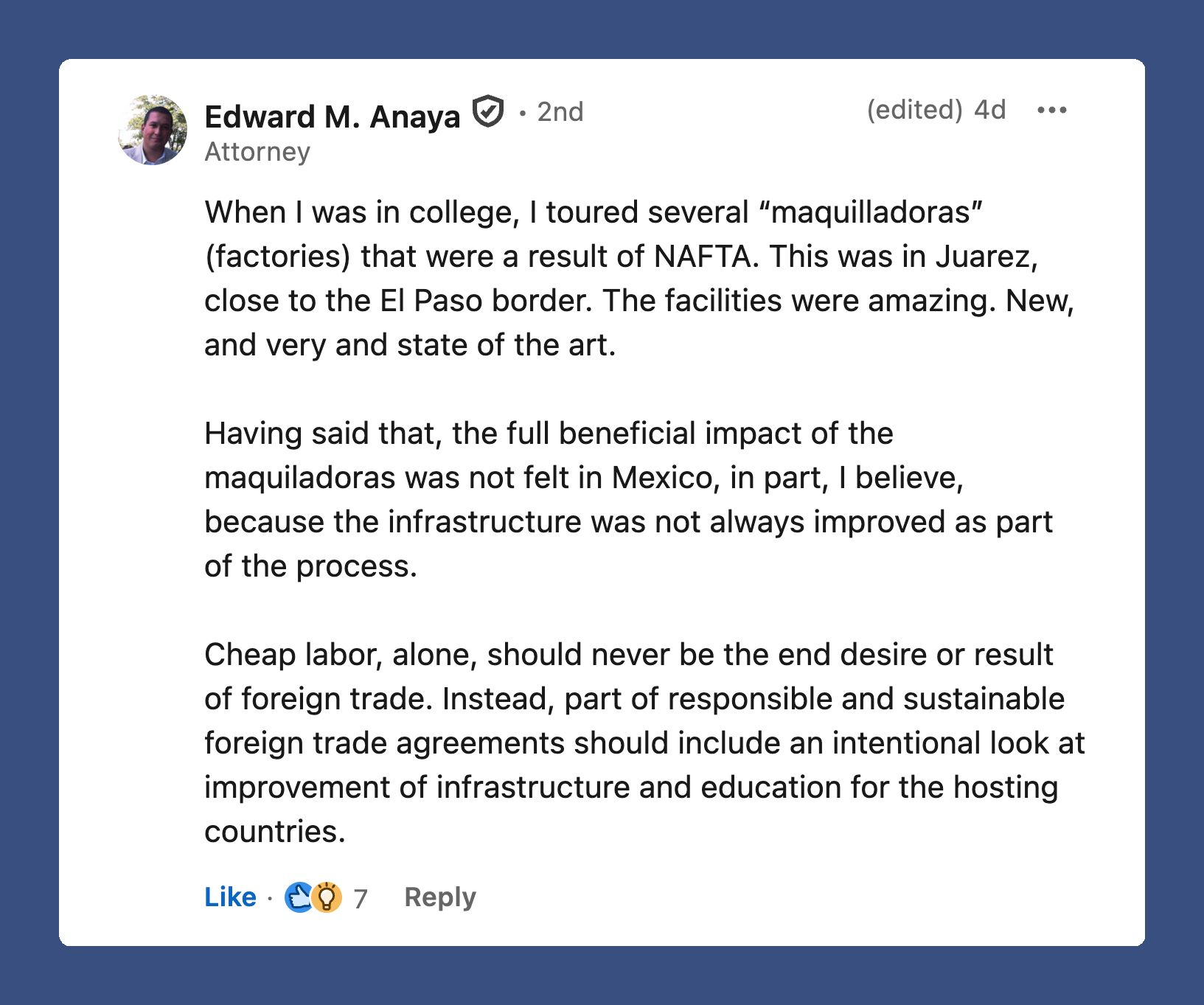 Edward tells his story of growing up with the maquiladoras in Juarez, Chihuahua. “Cheap labor, alone, should never be the end desire or result of foreign trade.” Well said.