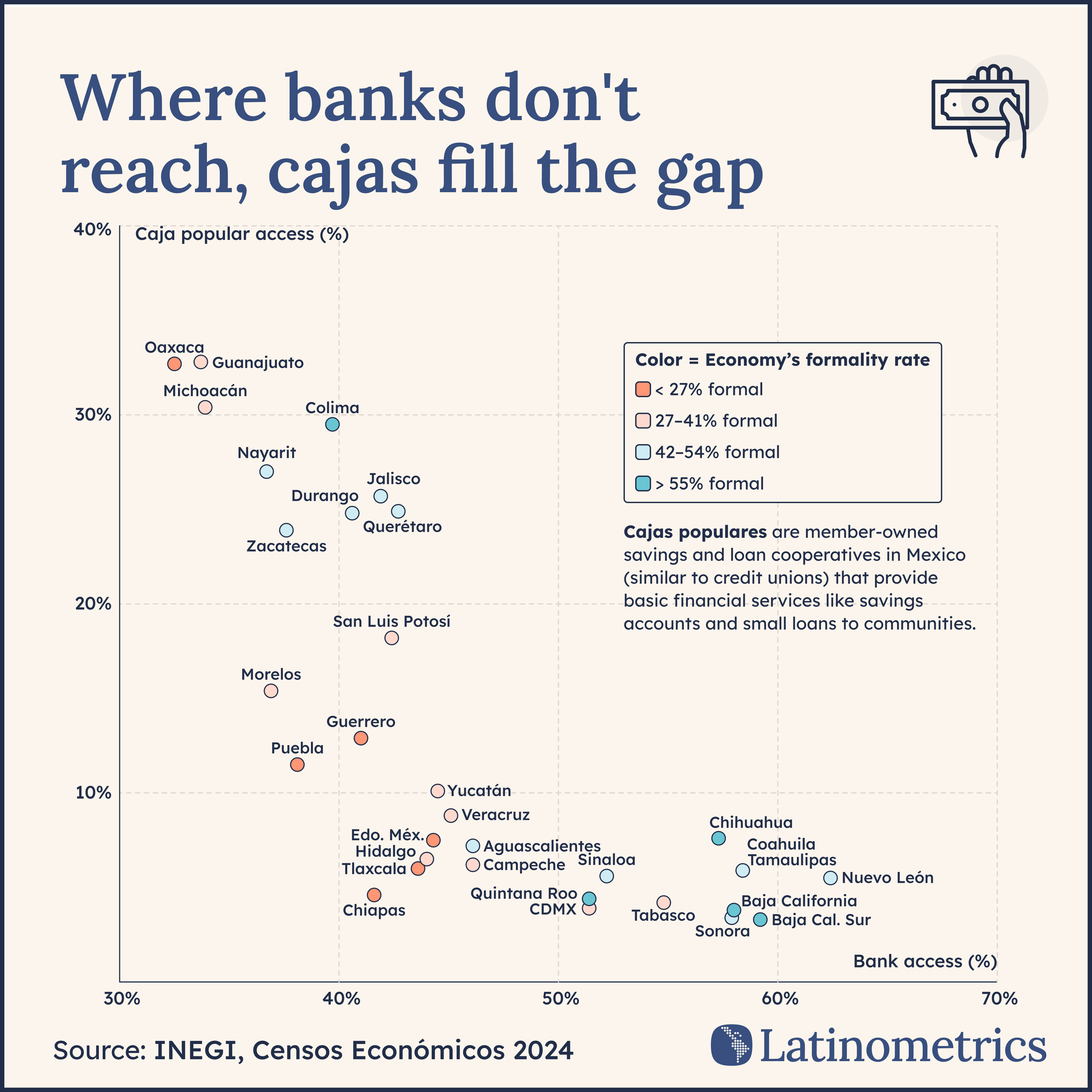 Today, Mexico’s two financial systems transcend debates of formality to encompass geographic and social elements, with a more banked north, a more cooperative south, and millions of Mexicans and companies still operating without access to reliable credit. Where the banks don’t reach, Mexicans have built a second financial architecture to compensate.