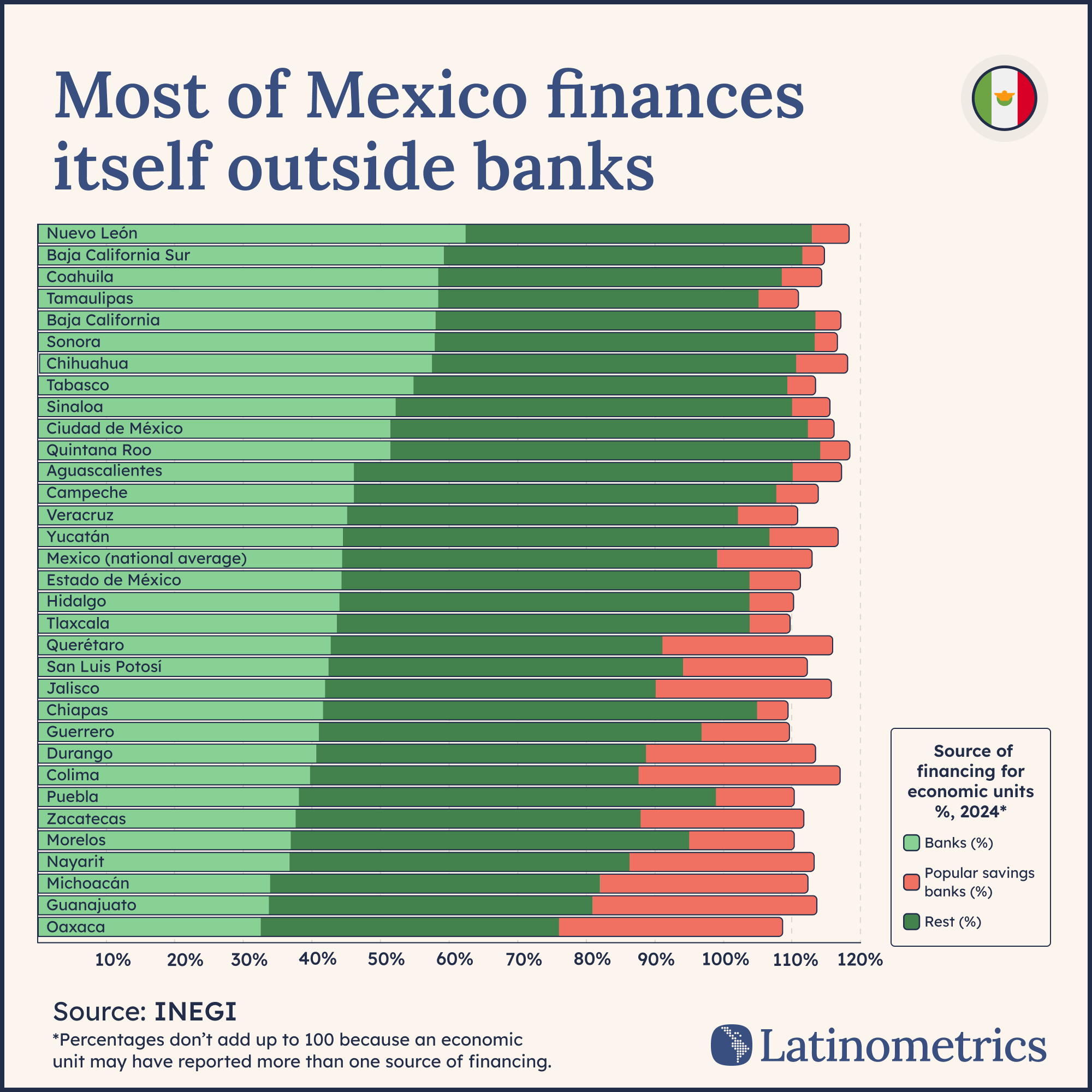 On average, Mexican businesses can obtain half the credit as a percentage of GDP (25%) than their peers across the rest of Latin America at 47%. That financing gap alone explains why the Mexican economy continues to run on self-finance, family loans, supplier credit, informal savings…really, everything other than the formal banking system.